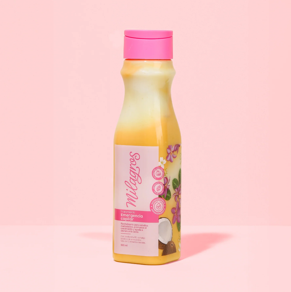 Rescata tu melena con el Tratamiento Emergencia Capilar Milagros 500 ml 💥. Diseñado para cabellos que han sufrido daño extremo por alisados, decoloraciones o exceso de calor, este tratamiento intensivo actúa en solo 20 minutos para devolver fuerza, brillo y vitalidad.